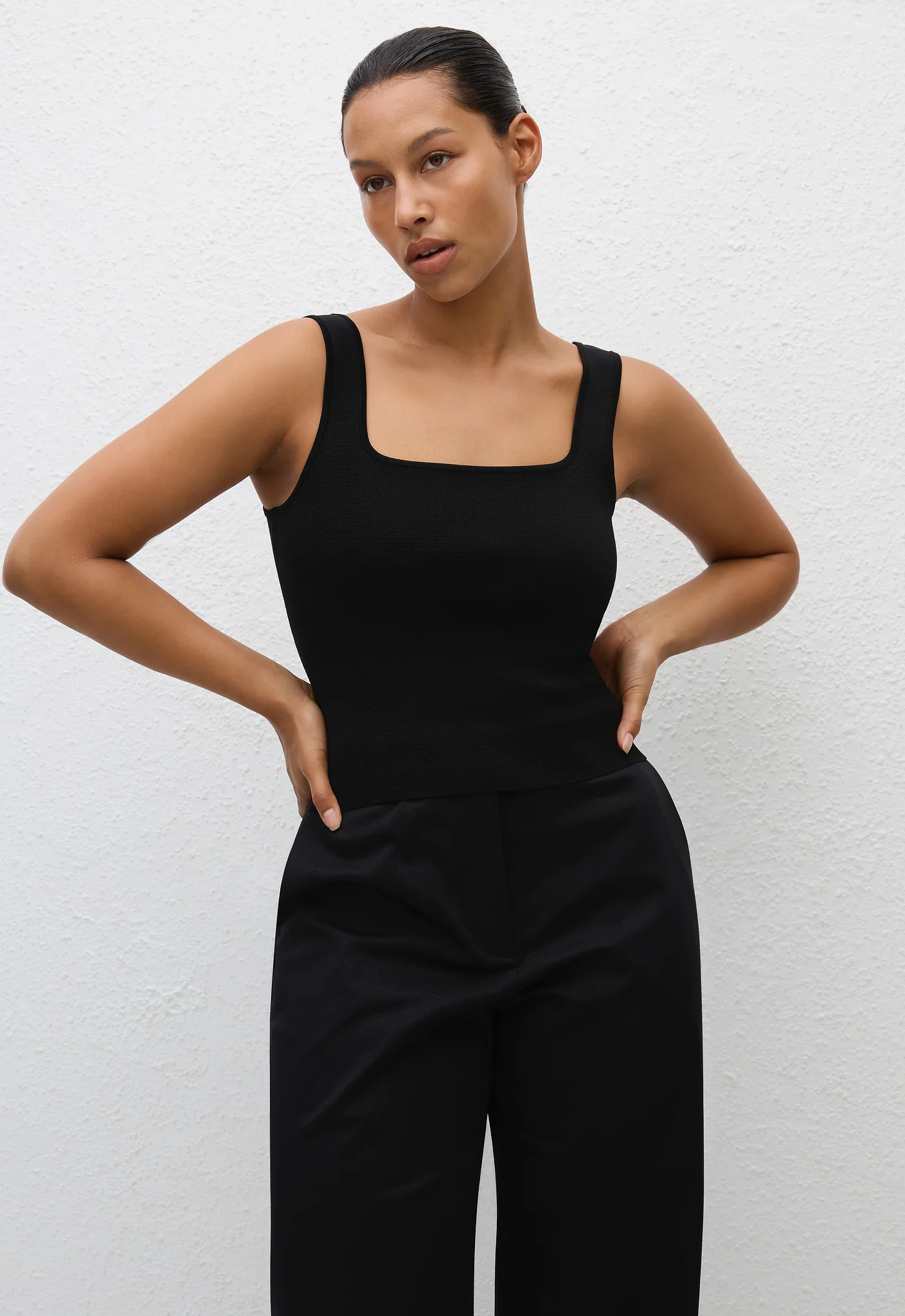 Inspired by a timeless 90s silhouette, this square neck tank is an elevated alternative to your favourite tank top. Offered in a bandage knit dry handle viscose for a perfect contoured fit. Easy with jeans and elegant with our Straight Twill Trouser.
