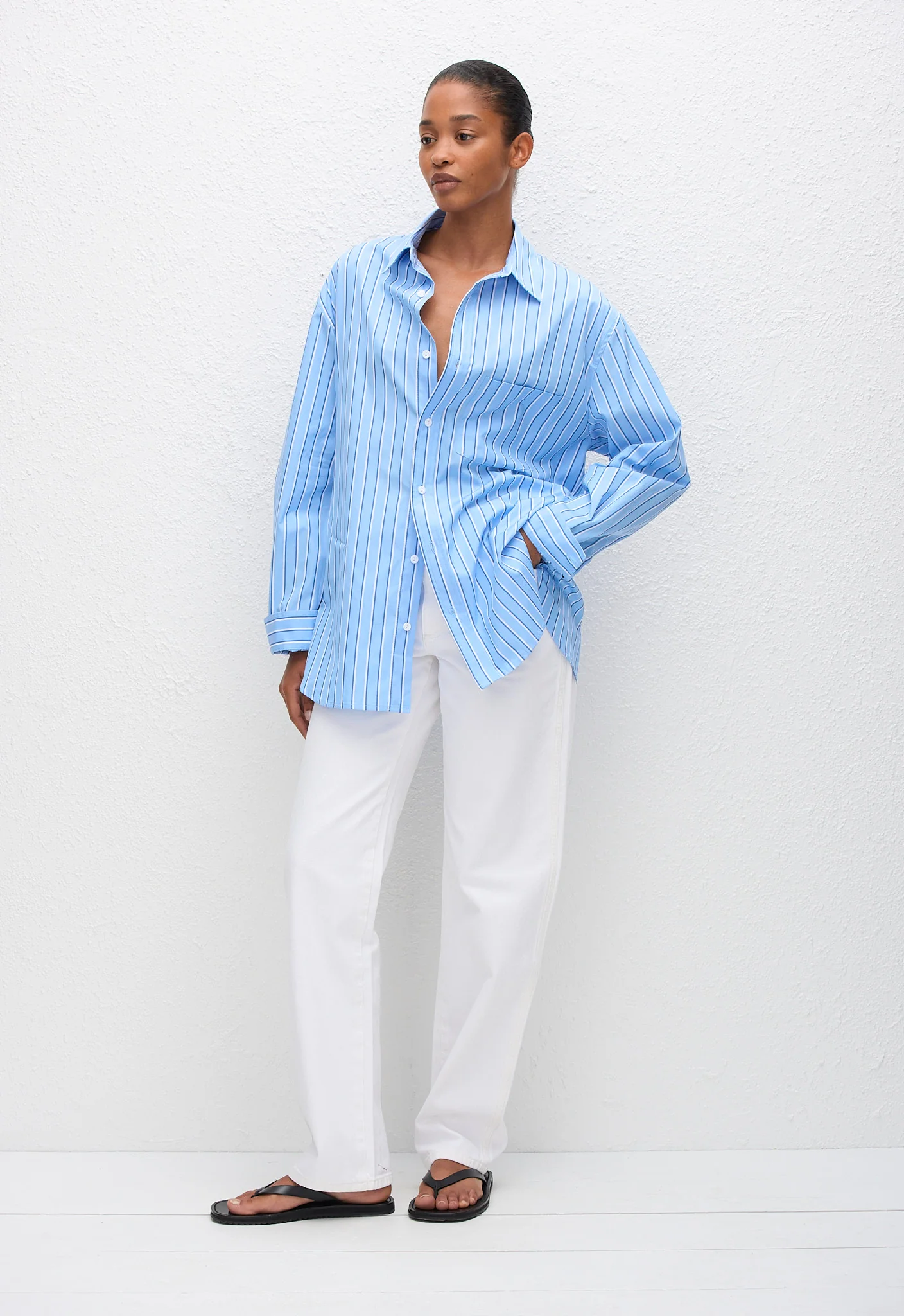 A classic, oversized menswear-inspired shirt with a single front pocket. Made in an organic cotton, this woven-stripe shirt offers a relaxed fit with curved hems at the front and back, and a single box pleat at back yoke. Wear tucked in to our Relaxed Jean, and pulled together with our Everyday Belt and a pair of sandals.