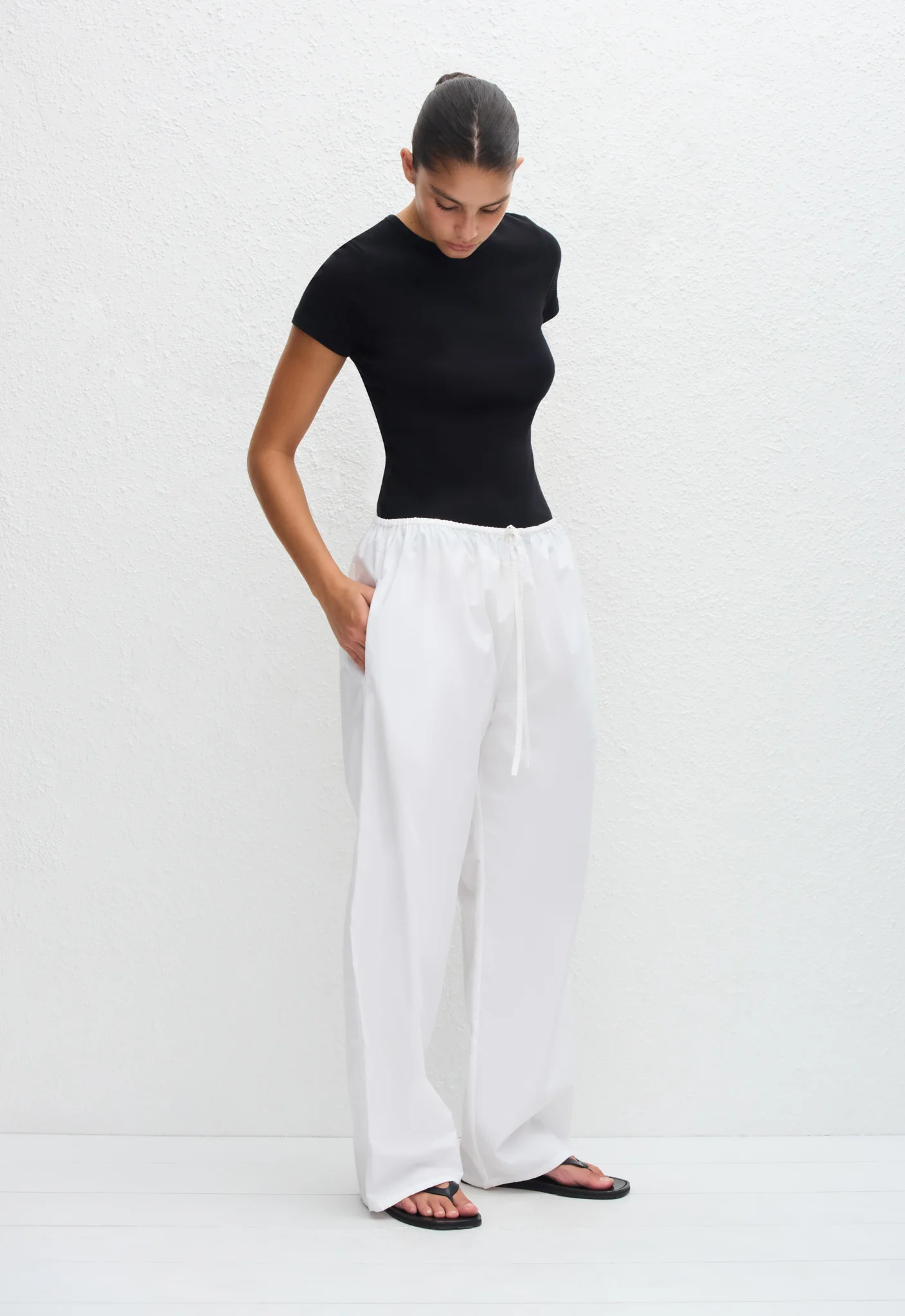 The perfect combination of comfort and style, this relaxed, straight-leg trouser's elastic waist and loose fit finds balance with an elegant length. Made from our organic cotton poplin with a washer finish, this style is perfect with our String Triangle bikini top or our Baby Tee.