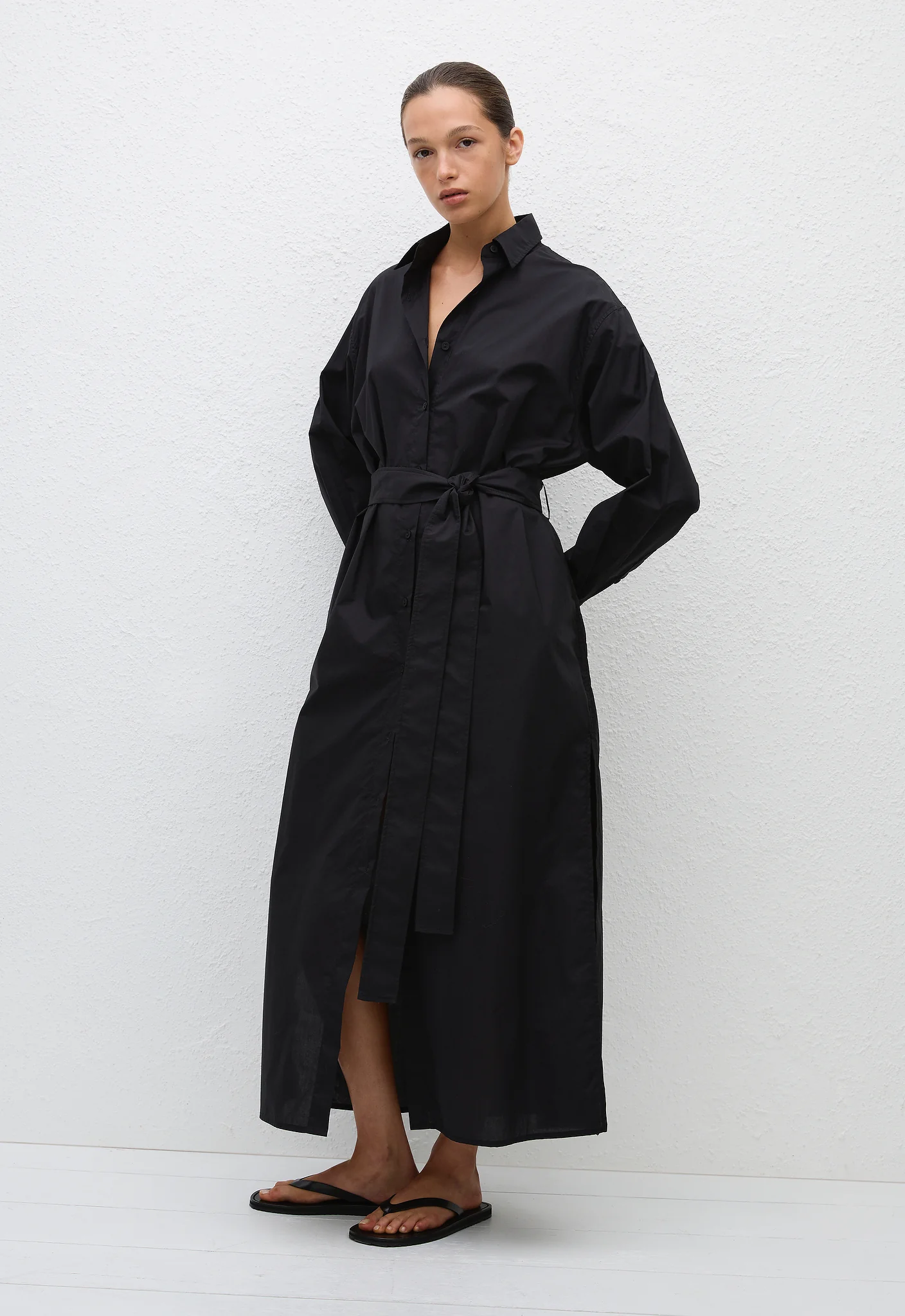 A relaxed button-down shirt dress with a removable belt at the waist. Featuring functional side pockets, elegant side splits and back yoke with traditional shirt detailing. Made from our organic cotton poplin, this piece can be worn with any sandals and pulled together with our Half Moon Belt.
