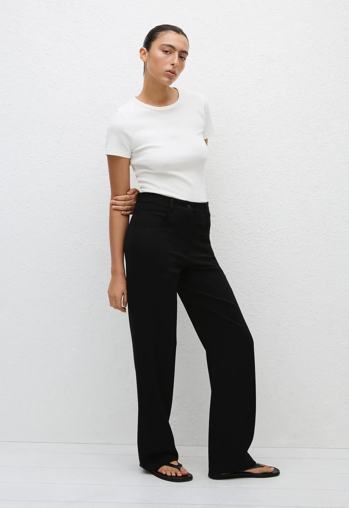A jean style, straight cut pant crafted in our easy-wear lightweight wool blend crepe. These pants feature traditional jean detailing of cut away pockets at the front, belt loops, fly-front and single button at the waistband. Style with a Ribbed Tank or elevate for evening with a Long Sleeve Silk Shirt.