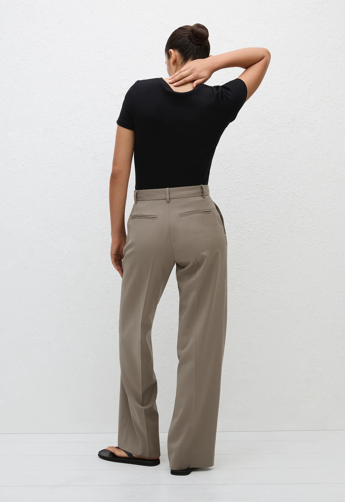 A menswear-inspired flat front trouser, with a relaxed fit and tailored waist band. Made from a lightweight wool blend suiting, they are finished with side pockets and a fly-front zip. Style as a set with the matching Tailored Waistcoat and Relaxed Tailored Blazer or with our Ribbed Tank.